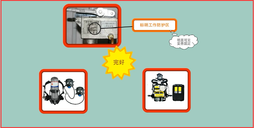 4、防護(hù)區(qū)外專(zhuān)用的空氣呼吸器或氧氣呼吸器是否完好;