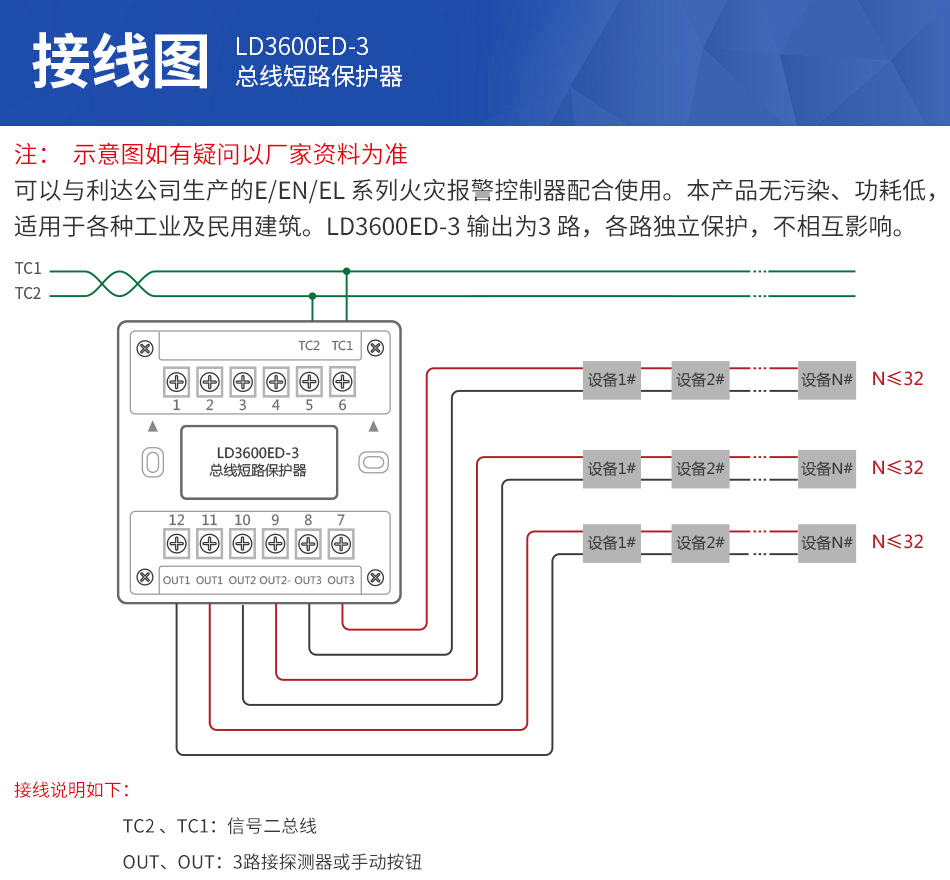 LD3600ED-3主要用于火災(zāi)報(bào)警控制器的二總線回路中,隔離線路中的短路點(diǎn),保證線路中的其他設(shè)備的正常運(yùn)行??梢耘c利達(dá)公司生產(chǎn)的E/EN/EL系列火災(zāi)報(bào)警控制器配合使用。本產(chǎn)品無(wú)污染、功耗低,適用于各種工業(yè)及民用建筑。LD3600ED-3輸出為3路,各路獨(dú)立保護(hù),不相互影響。