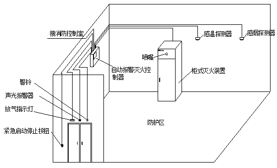 當(dāng)兩種探測器發(fā)出火災(zāi)信號(hào)時(shí),控制主機(jī)啟動(dòng)警鈴和聲光報(bào)警器,聯(lián)動(dòng)關(guān)閉防護(hù)區(qū)開口,進(jìn)入滅火啟動(dòng)延時(shí),達(dá)到設(shè)定的延時(shí)時(shí)間后,自動(dòng)啟動(dòng)滅火裝置。