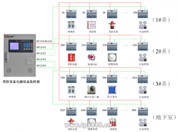 根據(jù)智能化管理要求,需要對(duì)整個(gè)商場(chǎng)綜合樓的消防設(shè)備供電電源的工作狀態(tài)進(jìn)行全過程連續(xù)監(jiān)測(cè)、集中控制和統(tǒng)一調(diào)度。