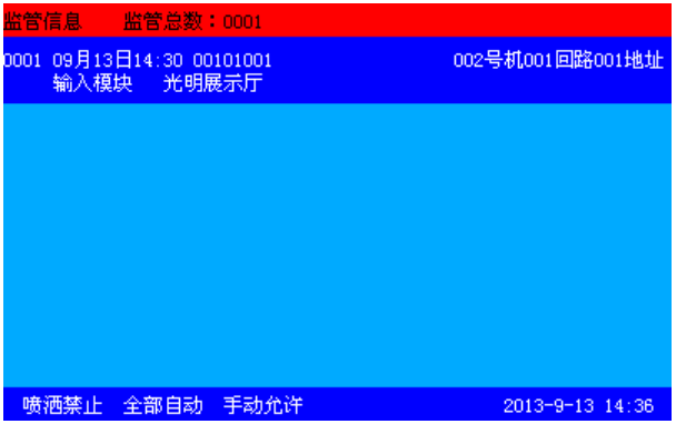 本控制器可在總線上連接輸入模塊,可通過總線部件設(shè)置成監(jiān)管模式。當(dāng)發(fā)生監(jiān)管報(bào)警后控制器將進(jìn)入監(jiān)管報(bào)警信息顯示(如圖3-5所示),同時(shí)監(jiān)管指示燈常亮。