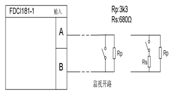 如上圖,AB端引出的兩根線接在被監(jiān)控設(shè)備的干節(jié)點(diǎn)觸點(diǎn)兩端(常開或常閉),電阻Rp接在被監(jiān)控設(shè)備端。顧名思義,監(jiān)控開路就是指當(dāng)A、B兩根線任何一根與被監(jiān)控設(shè)備的連接中斷就會(huì)報(bào)開路故障。這也是為什么Rp接在被監(jiān)控設(shè)備端的目的。如果接在輸入模塊端,那么即使連線出現(xiàn)中斷,也不報(bào)故障,這樣正常的輸入信號(hào)就無(wú)法傳遞給輸入模塊,消防主機(jī)也無(wú)法報(bào)出事件。